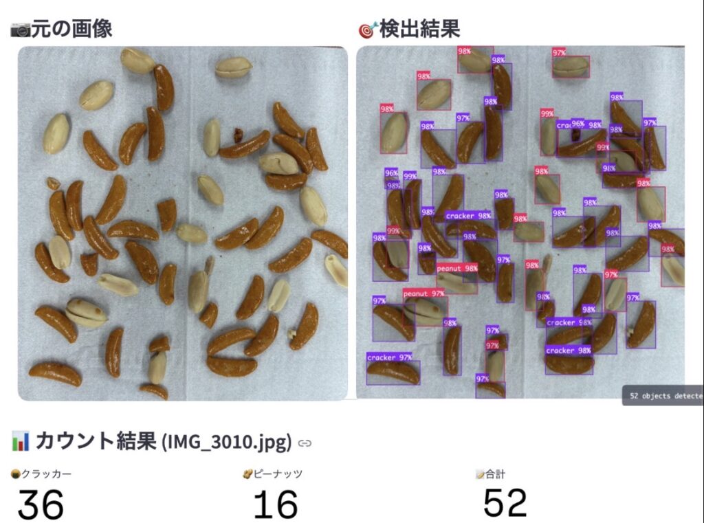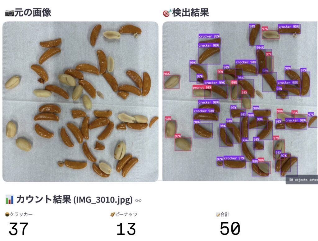 今回ムクイルでは、柿ピーの「クラッカー」と「ピーナッツ」を対象に、個数を自動でカウントする物体検知モデルを試作しました。カメラで撮影した画像をAIに入力すると、クラッカーとピーナッツを一粒ずつ検出し、「クラッカーが何個」「ピーナッツが何個」「合計何個」とカウント結果を返してくれます。