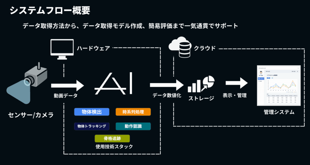 「データ解析ソリューション」は、現場に設置したカメラやセンサーがとらえた作業動作をAIが自動で分類・骨格追跡・スコア化し、そのままレポート化まで一貫して行う革新的なツールです。従来は見えにくかった作業フローや熟練者の手順、工数データを可視化し、生産性向上・品質安定・技能伝承といった多様な現場課題をまとめて解決します。これにより、データ不足で停滞していたAI・DX推進の第一歩を無理なく踏み出せる環境を整えます。