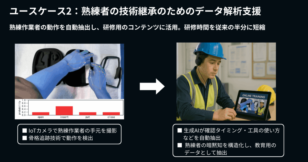 熟練者の手元や動作をIoTカメラ・センサーで記録し、生成AIが判断ポイントを自動抽出。テキスト・図・動画に整理して研修コンテンツに活用し、研修時間を半減、スキル習得を大幅に加速しました。