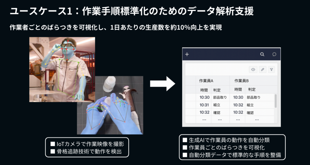 IoTカメラで製造ラインを撮影し、生成AIが「部品を取る」「組み立てる」「確認する」といった動作を自動分類・タイムスタンプの付与。手順や所要時間のばらつきを可視化して「標準手順」を整備した結果、ミスと時間ロスを削減し、1日あたりの生産数を約10%向上させました。