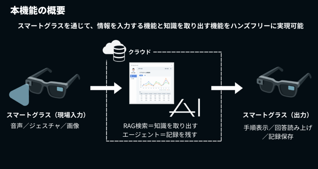 本機能は、「RAGによる検索・要約(知識の取り出し)」と、「エージェントによる自動実行・記録(情報の入力)」をスマートグラスでハンズフリーに実現できる点が特徴です。