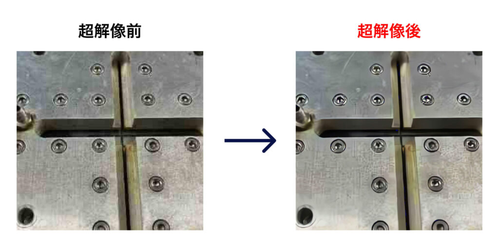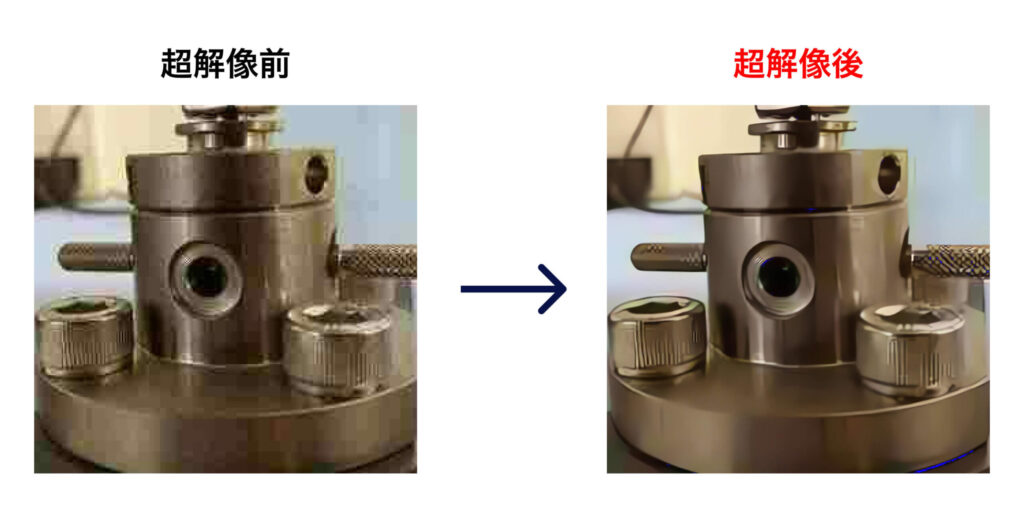 本技術は、AI技術を用いた高度な画像補完モデルを採用しており、細部の表現力が格段に向上しています。一般的な画像拡大では、ぼやけやノイズが発生し、画質が劣化してしまうことが課題でしたが、本技術は解像度を上げながらも、オリジナルの質感や色調を忠実に再現。特にねじや歯車といった工業製品の繊細なディテールを正確かつ滑らかに描写でき、エッジ判定などの簡易化に貢献します。